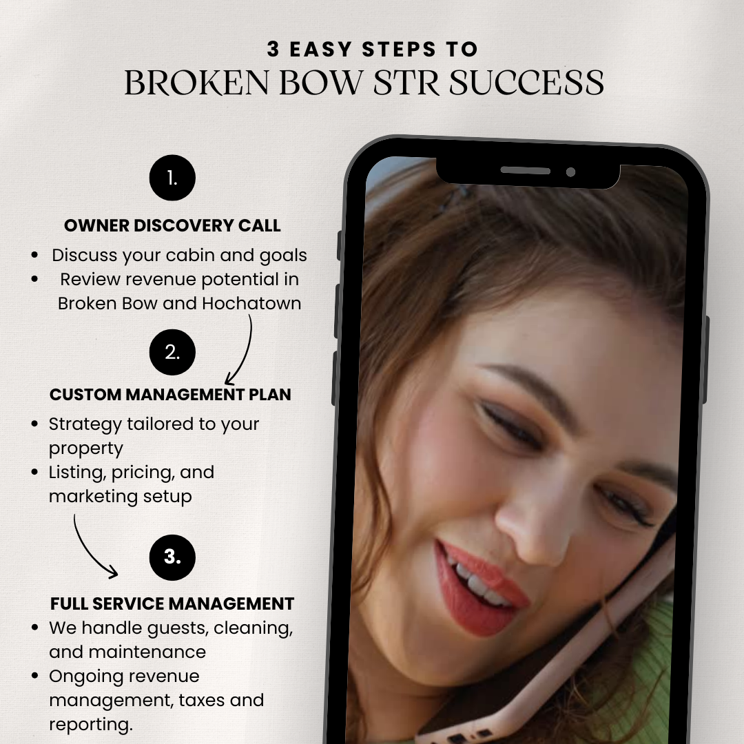 Schedule a call today with one of our Broken Bow, Hochatown and SE Oklahoma area Short Term Vacation Rental Experts.