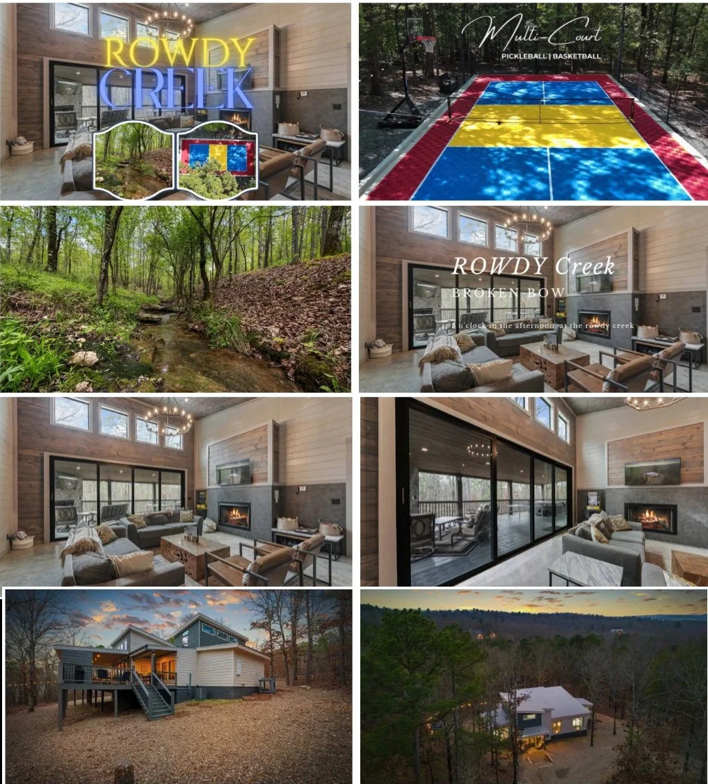 A luxurious cabin nestled in a lush, wooded setting with its own serene creek. Perfect for creating lasting memories, this private haven offers a peaceful retreat while being close to Hochatown's attractions. Enjoy 1.5 acres of forested outdoor space, complete with a hot tub, fire pit, and a porch featuring a grill, TV, fireplace, and dining area. The open and airy design ensures a sumptuous, satisfying stay in nature’s embrace. With additional amenities like a moveable rising desk, pickleball court, outdoor games, and a coffee bar, this property caters to both relaxation and productivity.